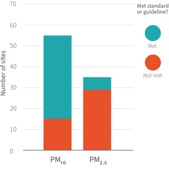 Of the 15 monitoring sites that did not meet the NES-AQ for PM10 in 2024, eight sites (or 53%) have had improving air quality, and two sites had declining air quality over the last 10 years. The trend was indeterminate at two sites, and three sites did not have enough data to determine a trend.