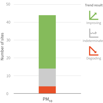 Of the 40 monitoring sites that met the national standards (NES-AQ) for PM10 in 2024, 22 sites (or 55%) have had improving air quality, two sites (or 5%) had declining air quality, and eight sites (20%) had indeterminate trends. The remaining eight sites did not have enough data available to calculate a trend.