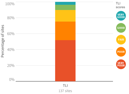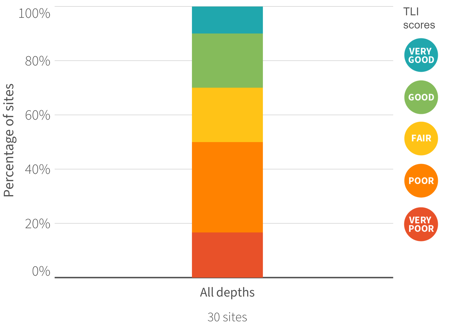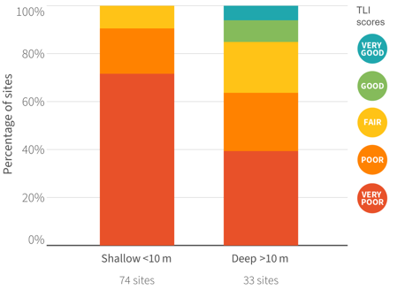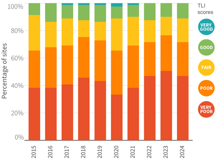 Note: The TLI dataset this year excluded many lakes from high country areas that have historically had TLI scores in the ‘fair’ to ‘very good’ categories. This means a higher proportion of lakes with overall poorer condition have been reported.