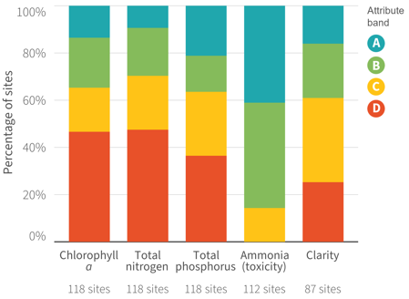 Around 65% of assessed lakes (75 for phosphorus, 83 for nitrogen) were in band C or D, suggesting these lakes are impacted by nutrient enrichment, with lakes in the D band already in a degraded state.