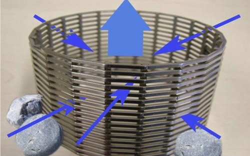 Figure 2. A typical well screen, showing how groundwater can enter the well through the screen mesh to be pumped up and out of the well, but aquifer material is held outside the well.