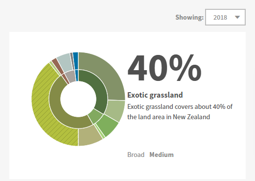 The land cover state is the area of land under each land cover class, at a particular LCDB snapshot date, primarily expressed as either a proportion (%) of the total land area being considered. The ‘current’ state is represented by the most recent snapshot date (i.e. 2018). Data for the 1996, 2001, 2008 and 2012 snapshot dates represents past states. The user can choose to view the data for a past state by selecting the snapshot date of interest. However, the narrative text describes the current state (2018) only. State data are presented for the broad- and medium-level classes in the Land Cover topic. The state data relating to the detailed classes can be viewed by downloading the data in spreadsheet form. An example of the presentation of the state data in the form of a ‘donut’ graph in the LAWA Land Cover topic is given in Figure 1 below. The user can hover over the different segments in the graph to view the proportion of the total land area covered by each class.